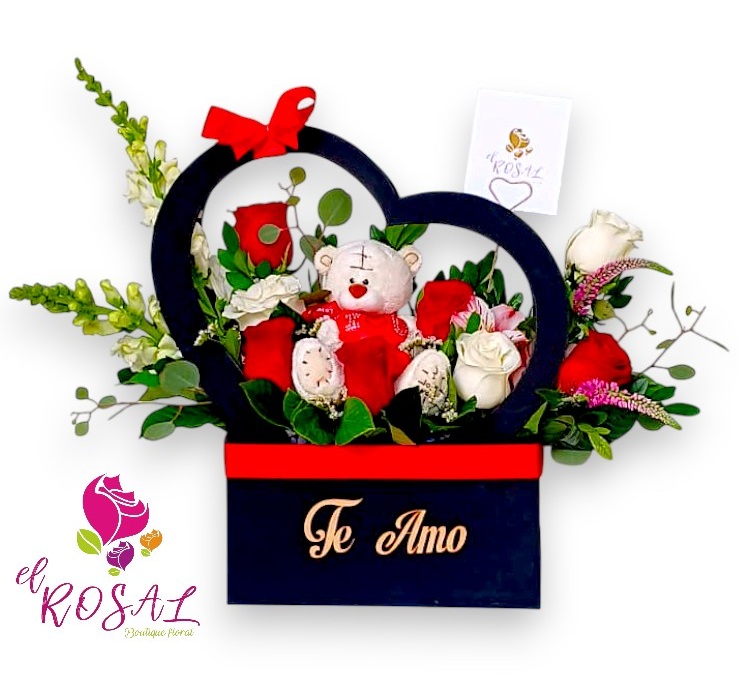 Box en corazón con 12 rosas importadas, 3 tulipanes, gardenias y mirra.