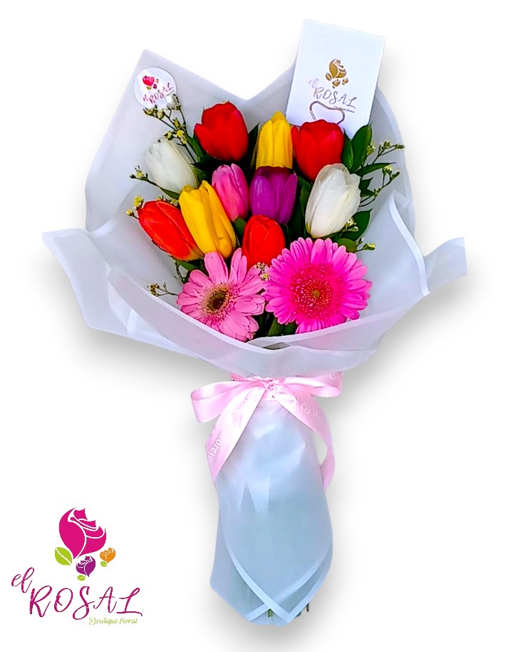 Ramo de 10 tulipanes, gerberas y follaje fino, envuelto en papel coreano.